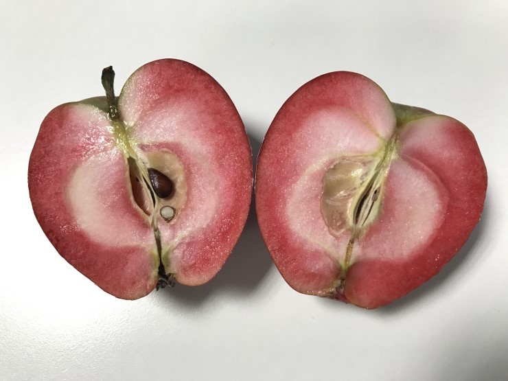 반으로 자르면 나타나는 붉은 색과 하트 모양이 예쁜 사과.