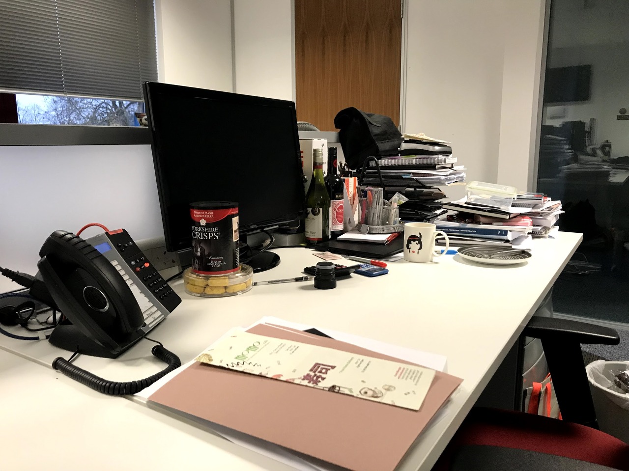 나의 오른쪽에 앉아있던 샤먼의 책상. 깔끔한 조와는 반대로.... 거의 백화점 수준 ㅋㅋ 한 해 전 크리스마스 선물로 받은 샴페인이 아직도 책상에 있음 ㅋㅋ
