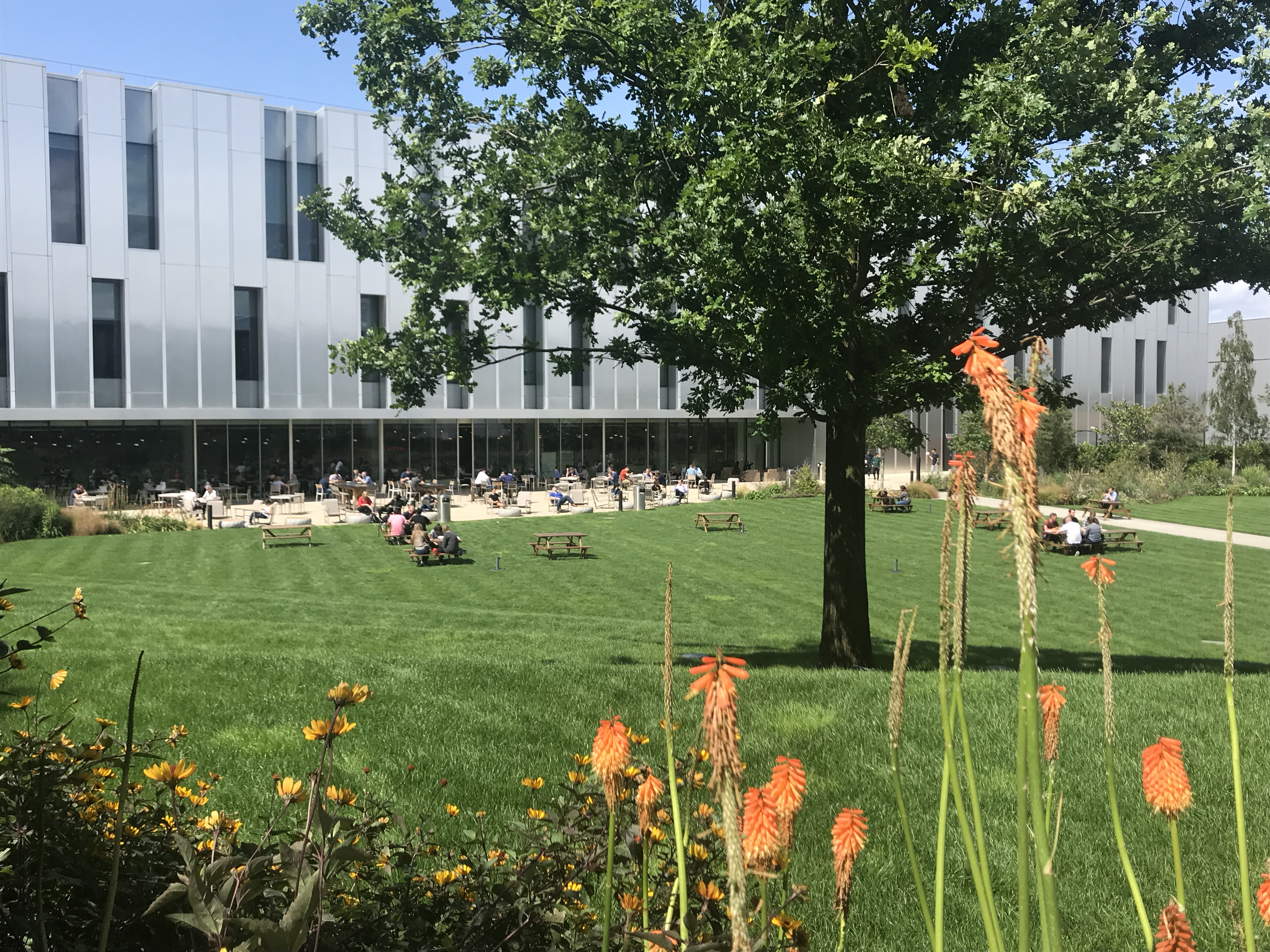 회사 짐에서 운동 후 나올때면 보이는 풍경. 앞에 보이는 은색건물 1층에 회사 식당이 있어서 여름엔 친구들과 잔디밭에서 점심을 먹기도 한다. 간혹 낮잠자거나 일광욕 하는 사람들도 있다.