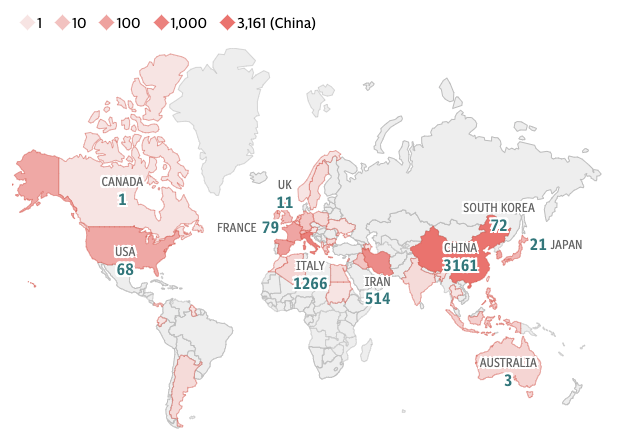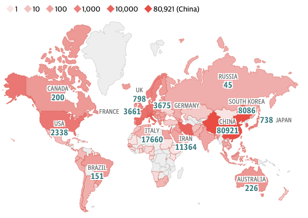 3월 14일 현재 전세계 코로나 바이러스 확진자 수 - Source: https://www.telegraph.co.uk/global-health/science-and-disease/coronavirus-vaccine-covid-19-treatments/
