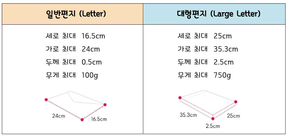 우체국에 들어서면 가장 먼저 내 편지가 일반편지인지 대형편지인지 크기를 재어봐야 해요. 직접 재는 것은 아니고 우체국 직원이 아래 그림과 같은 가이드를 이용해서 재어준답니다.